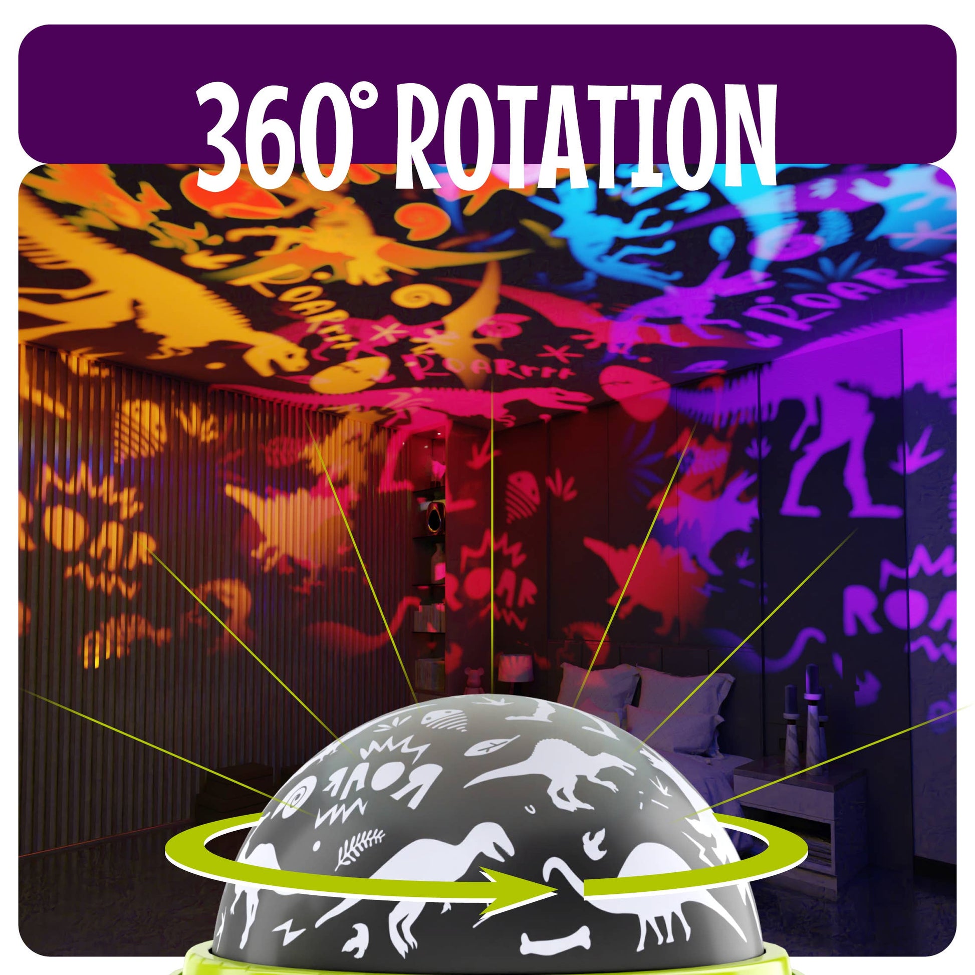 360° ROTATION - The projector spins around, making the dino shadows move all over your room. You can turn this on for a fun show or off for calm, still lights.
