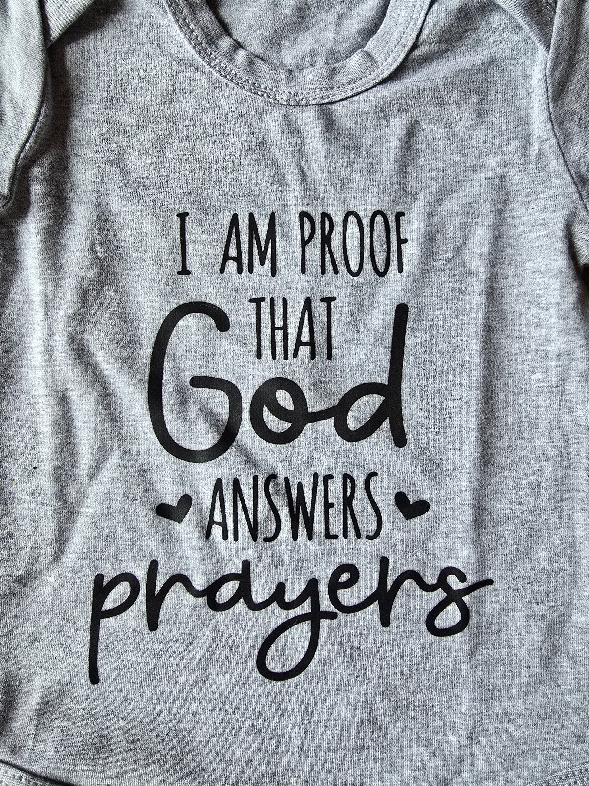 - Gray short sleeve onesie with 'I Am Proof That God Answers Prayers' saying
